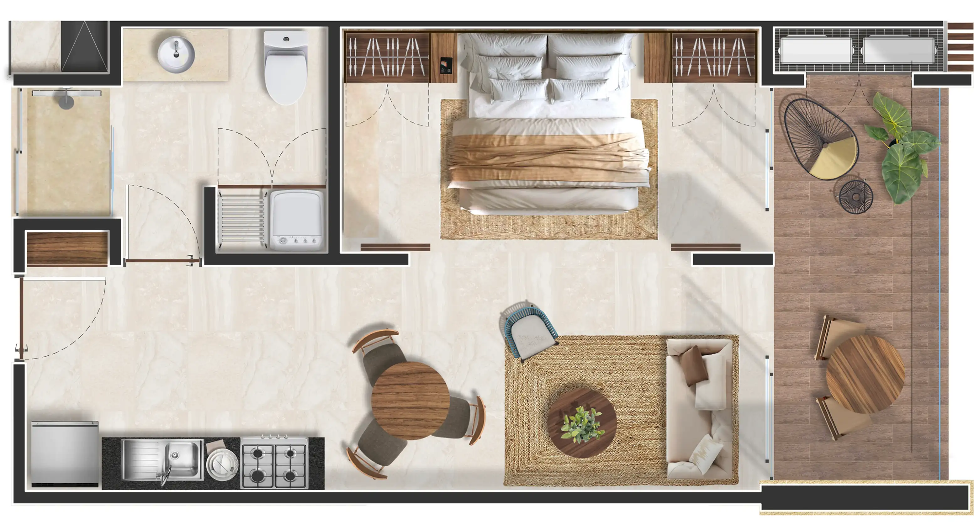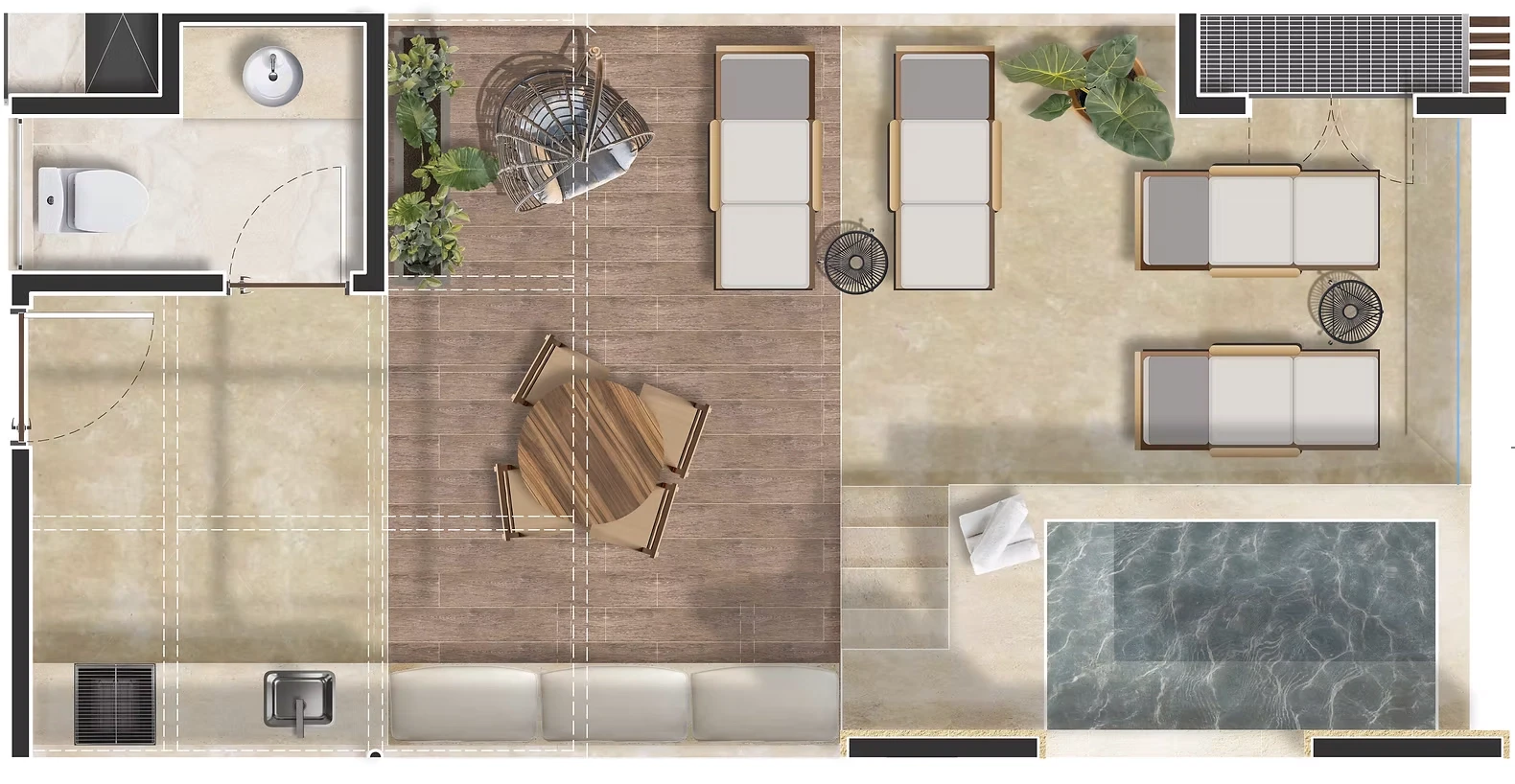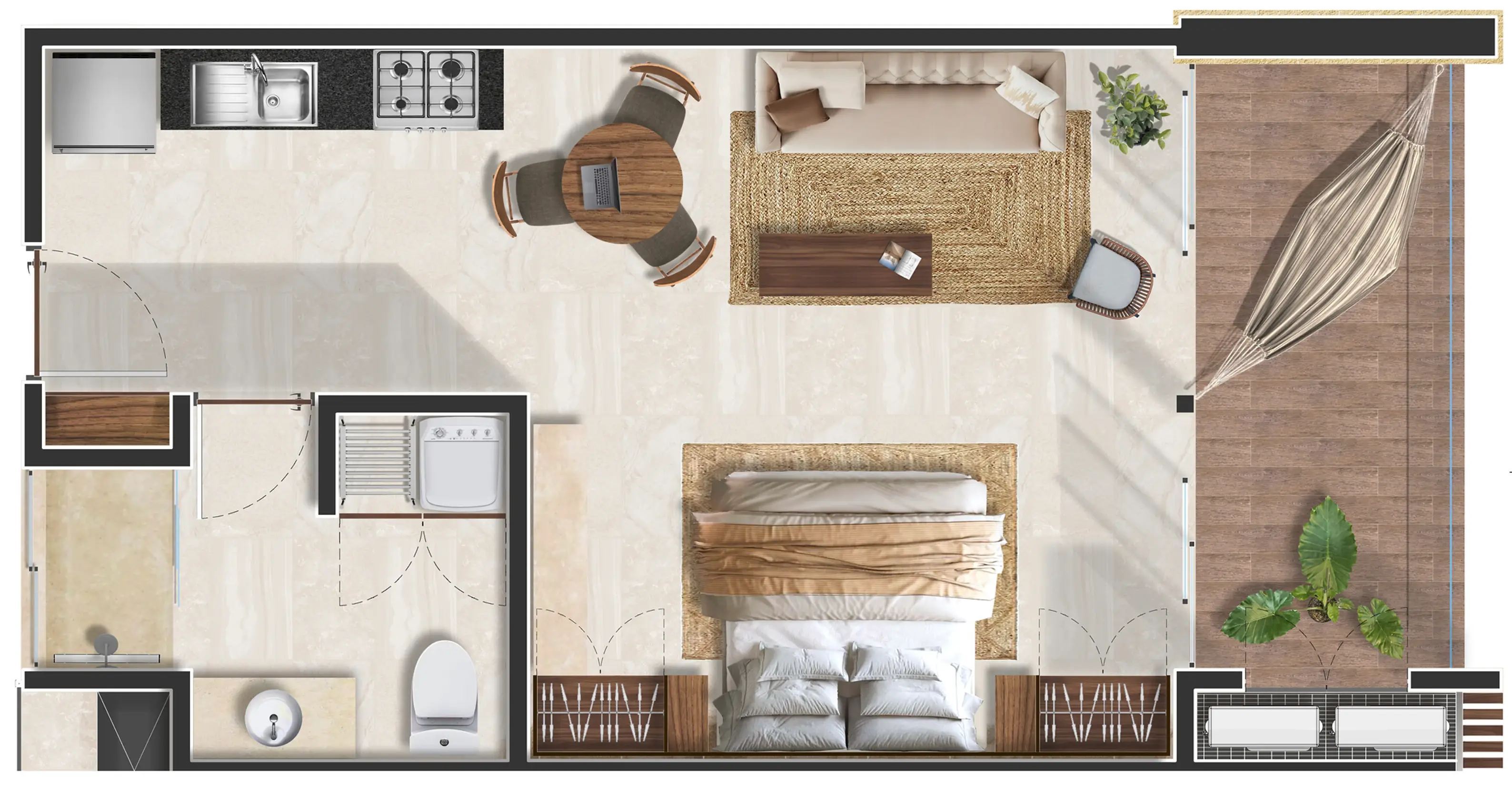 Rooftop con plunge pool, gimnasio, palapa bar y más de 10 amenidades.